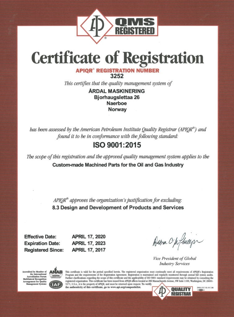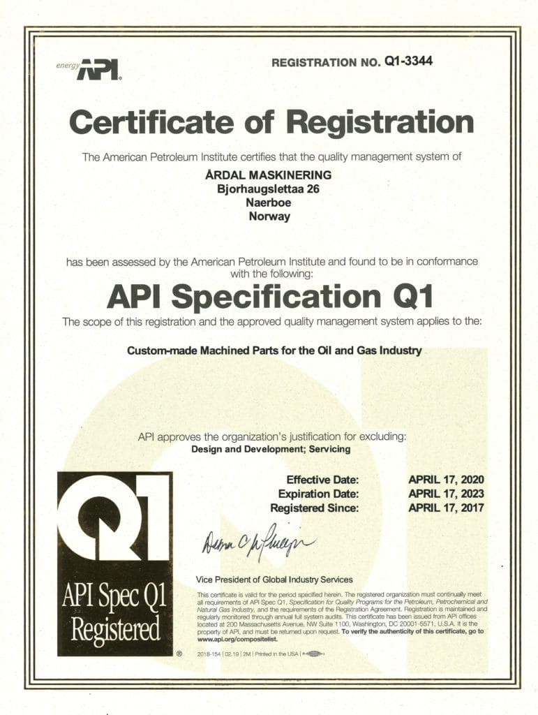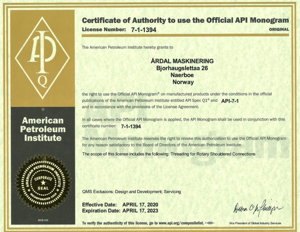 Bedriften er sertifisert iht API Q1 9th ed og ISO 9001:2015. I tillegg har vi API 7.1. lisens til å påføre monogram på API gjenger.